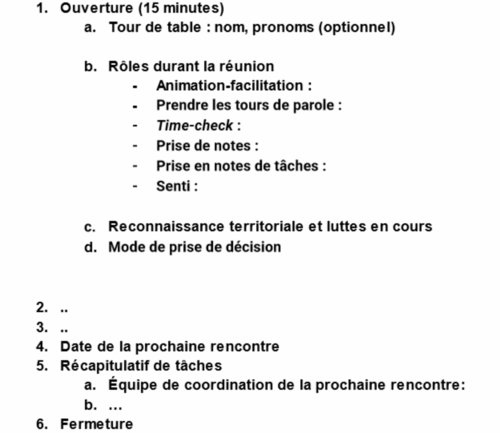 - the roles to be fulfilled for the meeting (facilitation, responsible for time, responsible for speaking turns, taking notes, taking notes of tasks)